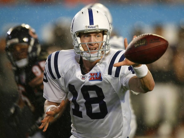 Indianapolis Colts quarterback Peyton Manning pitches out against the Chicago Bears during the second quarter of the NFL's Super Bowl XLI football game in Miami, Florida.Mike Blake/Reuters