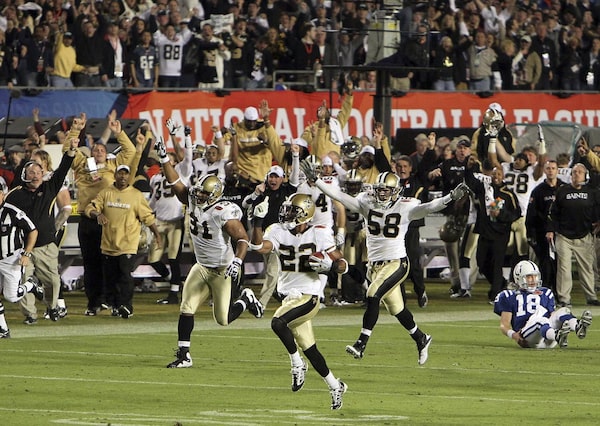 The New Orleans Saints intercept a ball thrown by Peyton Manning of the Indianapolis Colts and return it for a touchdown in the fourth quarter during Super Bowl XLIV in Miami Gardens, Florida.Jed Jacobsohn/Getty Images