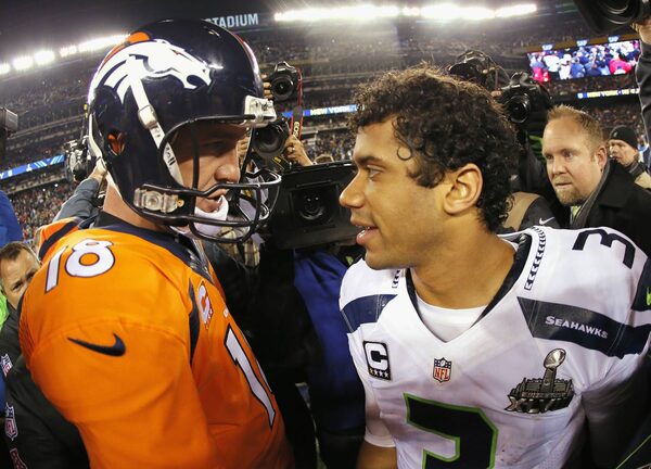 Quarterback Peyton Manning of the Denver Broncos congratulates quarterback Russell Wilson of the Seattle Seahawks on their 43-8 win during Super Bowl XLVIII at in East Rutherford, New Jersey.Kevin C. Cox/Getty Images