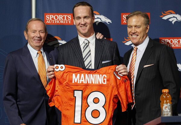 Quarterback Peyton Manning (C) holds his Denver Broncos jersey with Broncos vice-president John Elway (R) and team owner Pat Bowlen in Englewood, Colorado.RICK WILKING/Reuters