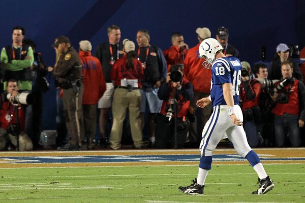 Peyton Manning of the Indianapolis Colts walks off the field after losing to the New Orleans Saints during Super Bowl XLIV in Miami Gardens, Florida.Ezra Shaw/Getty Images