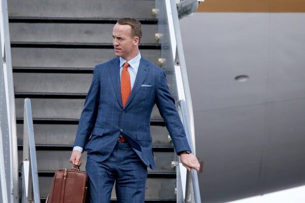 Peyton Manning exits a plane during team arrivals at the Mineta San Jose International Airport in preparation of Super Bowl 50 against the Carolina Panthers.Cary Edmondson
