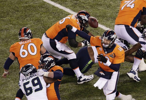 Quarterback Peyton Manning of the Denver Broncos has a pass blocked by the Seattle Seahawks during Super Bowl XLVIII in East Rutherford, New Jersey.Win McNamee/Getty Images
