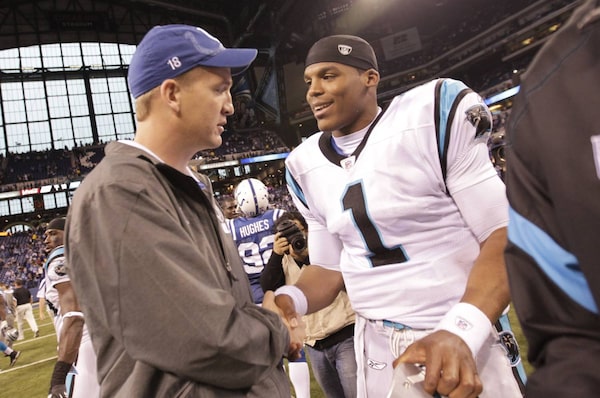 In this Nov. 27, 2011, file photo, injured Indianapolis Colts quarterback Peyton Manning meets with Carolina Panthers quarterback Cam Newton after an NFL football game in Indianapolis. Peyton Manning's AFC champion Denver Broncos face Cam Newton's NFC champion Carolina Panthers in the 50th Super Bowl in Santa Clara, California.AJ Mast/The Associated Press