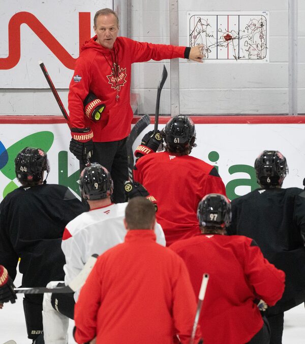 Jon Cooper, coach of Canada's team in the 4 Nations Face Off, leads the players through hockey practice in Montreal on Feb. 10, with two days to go till their first match against Sweden.Christinne Muschi/The Canadian Press