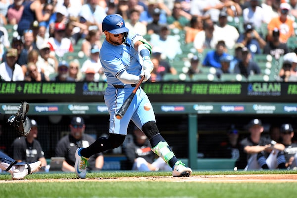 Bo Bichette of the Toronto Blue jays singles in the first inning of Sunday's game against the Detroit Tigers on Sunday in Detroit.Jose Juarez/The Associated Press