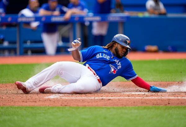 Toronto Blue Jays' Vladimir Guerrero Jr. slides home to score against the Tampa Bay Rays in the fifth inning at the Rogers Centre in Toronto on Sept. 15.Mark Blinch/Getty Images