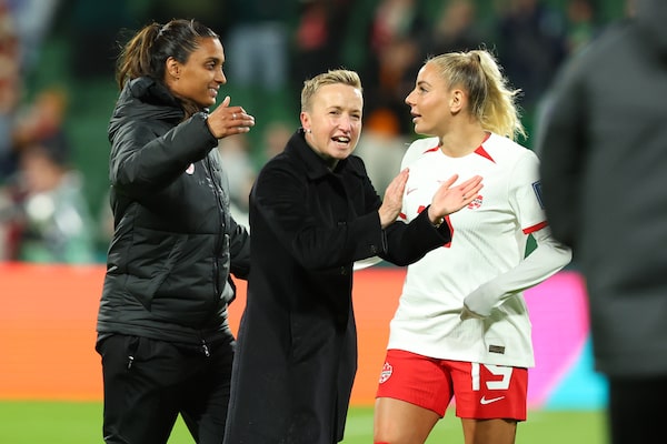 Canada coach Bev Priestman, centre, celebrates with Adriana Leon, right, after their 2-1 win over Ireland in Group B action at the FIFA Women's World Cup in Perth, Australia, on July 26.James Worsfold/The Canadian Press