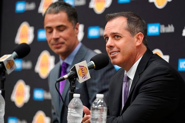 Los Angeles Lakers NBA basketball team general manager Rob Pelinka, left, introduces Frank Vogel as the Lakers new head coach at their training facility in El Segundo, Calif., on May 20, 2019.The Canadian Press