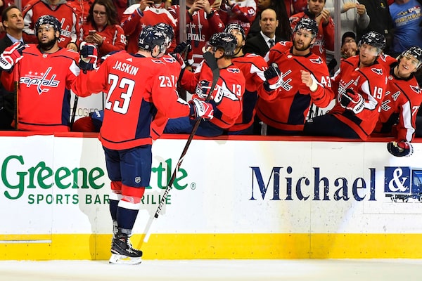 Capitals right winger Dmitrij Jaskin celebrates with teammates after scoring a goal against the Calgary Flames at Capital One Arena in Washington on Feb. 1, 2019.Brad Mills/USA TODAY Sports via Reuters