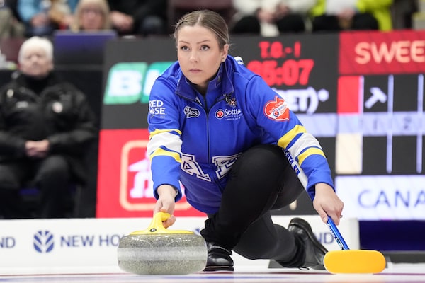 Alberta's Selena Sturmay throws a stone at the Scotties Tournament of Hearts in Mississauga, Ont., on Friday.Chris Young/The Canadian Press