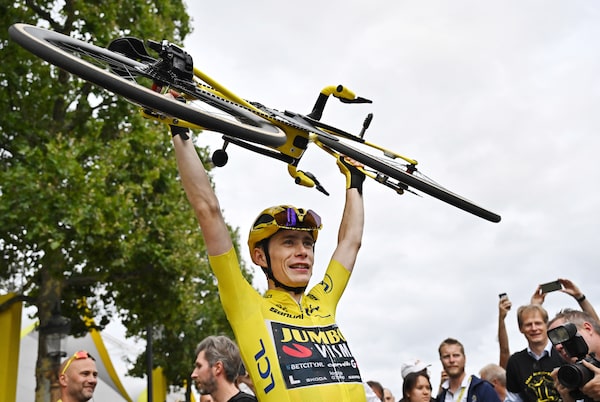 Jonas Vingegaard, the 26-year-old Dane, lifts his bike as he celebrates winning the Tour de France on July 23, 2023.MARCO BERTORELLO/Reuters