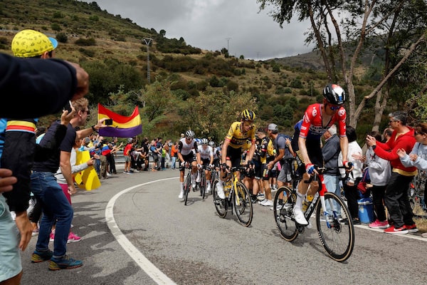 Fans line the road as team Jumbo-Visma's Dutch riders Dylan Van Baarle, right, and Robert Gesink climb the Puerto de la Cruz Verde pass during the stage 20 of the 2023 La Vuelta cycling tour of Spain, on Sept. 16.OSCAR DEL POZO/AFP/Getty Images