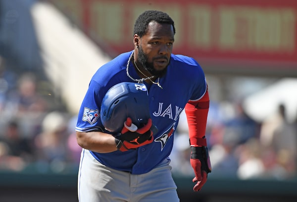 Vladimir Guerrero Jr. of the Toronto Blue Jays loses his helmet while running to first base during a spring training game against the Detroit Tigers last month at Publix Field at Joker Marchant Stadium in Lakeland, Fla.Mark Taylor/Getty Images