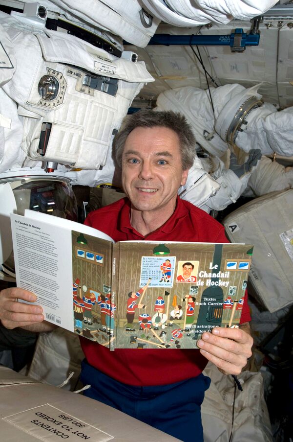 Canadian astronaut Robert Thirsk reading French and English versions of The Hockey Sweater aboard the International Space Station in 2009.Courtesy Robert Thirsk