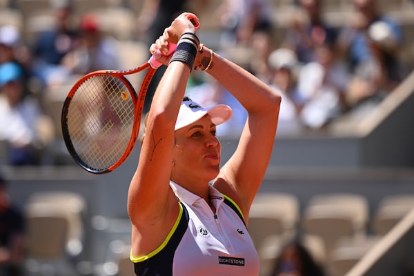 PARIS, FRANCE - JUNE 04: Anastasia Pavlyuchenkova celebrates winning match point against Elise Mertens of Belgium during the Women's Singles Fourth Round match on Day Eight of the 2023 French Open at Roland Garros on June 04, 2023 in Paris, France. (Photo by Clive Mason/Getty Images)CLIVE MASON/Getty Images