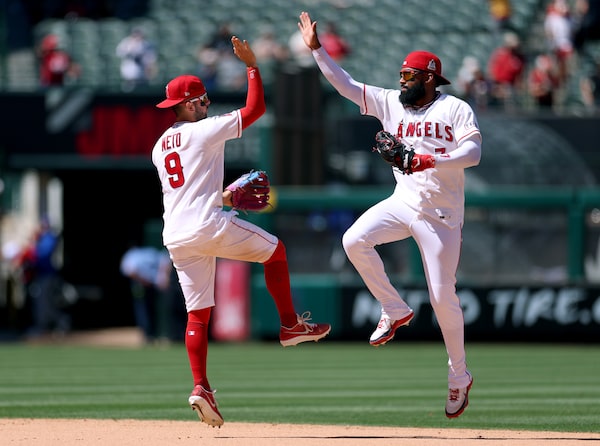 Jo Adell (right) celebrates a 7-3 win over the Toronto Blue Jays with Zach Neto at Angel Stadium of Anaheim on Wednesday.Harry How/Getty Images