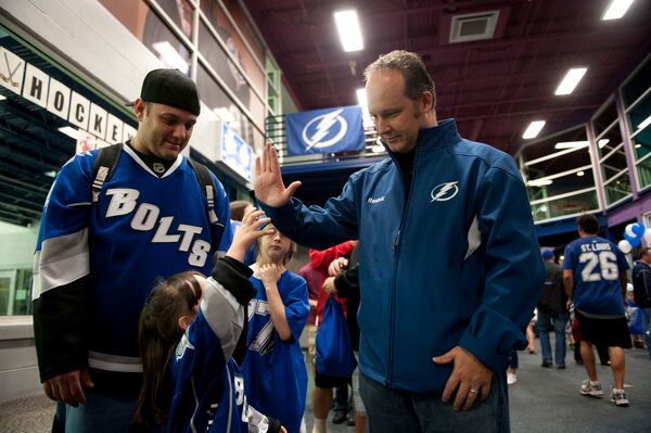 Tampa Bay Lightning CEO Steve Griggs high fives a fan at the Ice Sports Forum on Sept. 17, 2011.SCOTT AUDETTE
