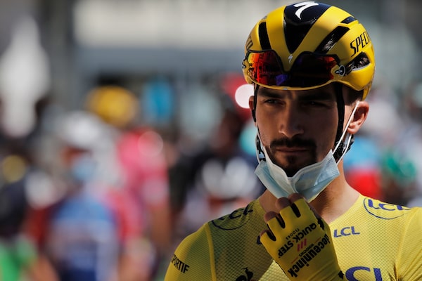 Julian Alaphilippe, wearing the overall leader's yellow jersey, adjusts his mask at the start of the fifth stage of the Tour de France in Gap, France, on Sept. 2, 2020.Christophe Ena/The Associated Press