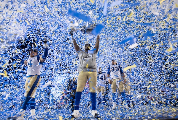 The Winnipeg Blue Bombers celebrate after winning the 107th Grey Cup in Calgary on Sunday, Nov. 24, 2019.Nathan Denette/The Associated Press