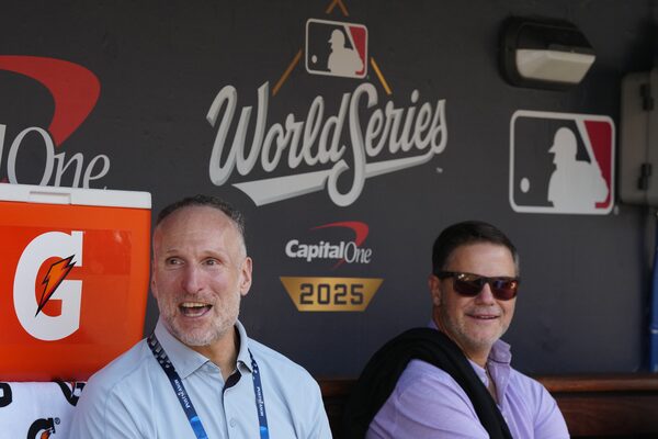 Toronto Blue Jays general manager Ross Atkins, right, and president and CEO Mark Shapiro are seen in the dugout prior to Game 3 of the World Series in Los Angeles.Frank Gunn/The Canadian Press