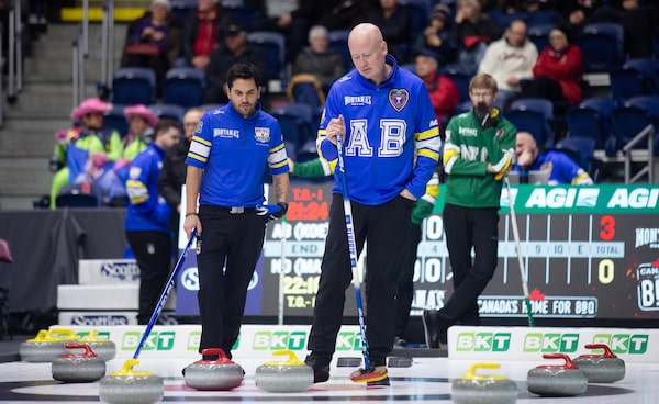 Team Alberta Vice-skip Aaron Sluchinski, left, and Skip Kevin Koe study the house during Draw 14 at the Montana's Brier Canadian men's curling championship, in St. John's on Wednesday.Paul Daly/The Canadian Press