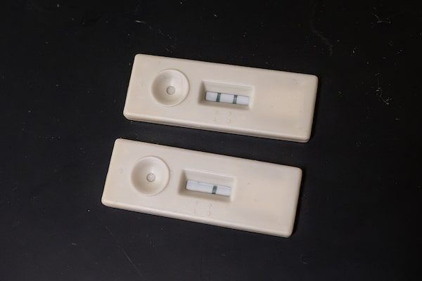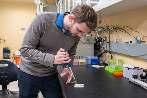 Research and development engineer Oliver Aramini tests sample saliva on a strip not unlike a COVID-19 test, right down to the double stripe system.