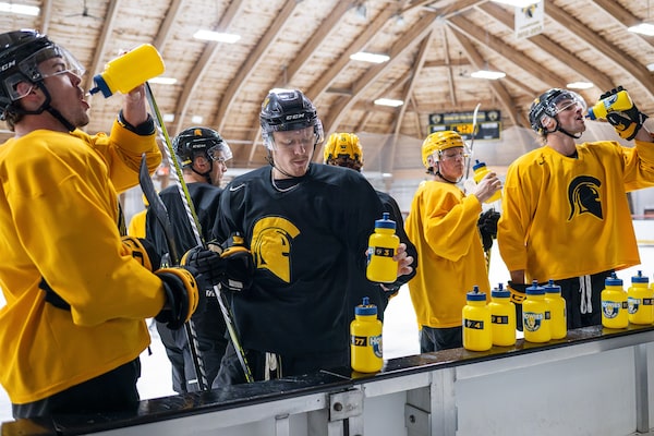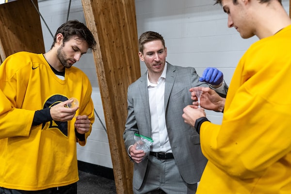 Before an early November practice inside the University of Waterloo’s wood-beamed arena, a few players from the men’s hockey team agreed to spit into small plastic funnels in the name of science. It took just a few seconds on their way from the dressing room to the ice.