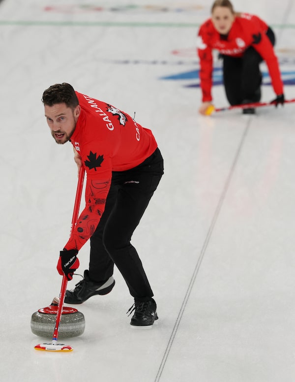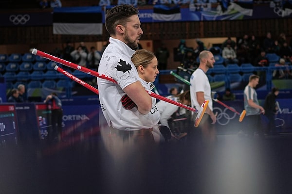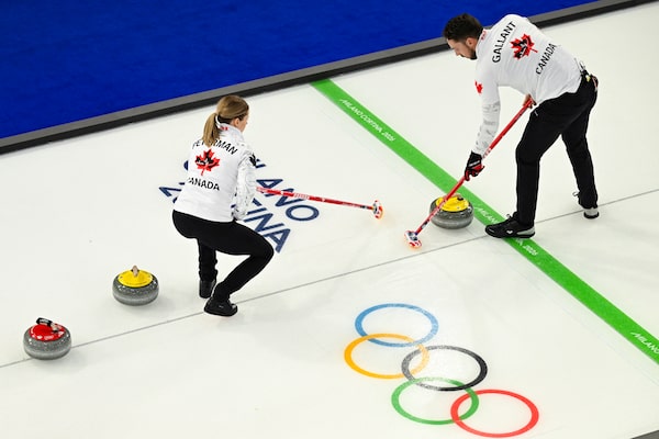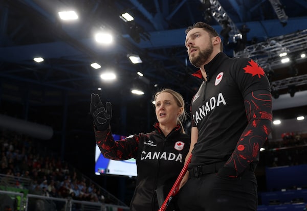 Canada curling duo Brett Gallant and Jocelyn Peterman compete in the mixed doubles round robin phase of the competition against Switzerland on Monday in Cortina d'Ampezzo, Italy.Fatima Shbair/The Associated Press