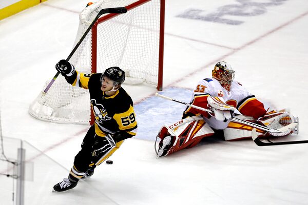 Pittsburgh Penguins' Jake Guentzel (59) celebrates after defeating Calgary Flames goaltender David Rittich (33) with his winning overtime goal.Gene J. Puskar/The Associated Press