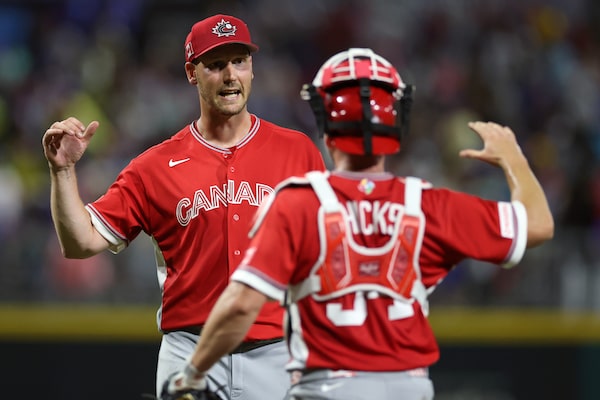 Brock Dykxhoorn of Team Canada celebrates with Liam Hicks after recording the last out of the 3-2 victory against Team Puerto Rico at Hiram Bithorn Stadium in San Juan on Tuesday.Al Bello/Getty Images
