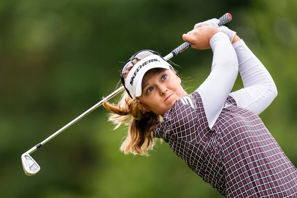 Brooke Henderson tees off on Saturday during the third round of the CPKC Women’s Open in Mississauga, Ont. Henderson is Canada's most successful golfer, with 13 LPGA titles.Thomas Skrlj/The Canadian Press