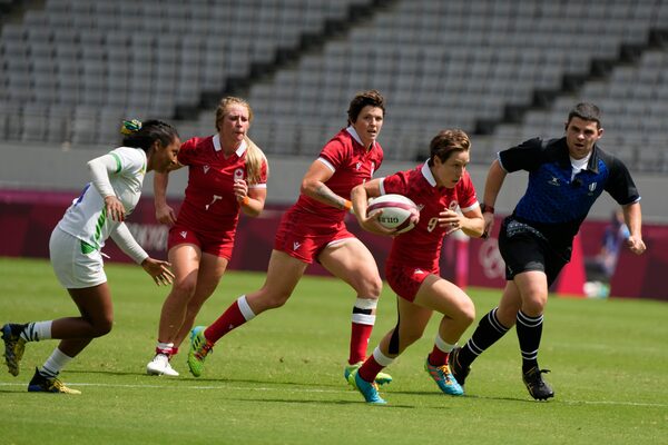 Canada's Ghislaine Landry runs with the ball in Canada's women's rugby sevens match against Brazil at the 2020 Summer Olympics, Thursday, July 29, 2021.Shuji Kajiyama/The Associated Press