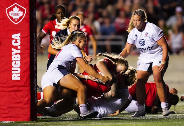 Canada's Olivia DeMerchant (18) scores a try as she is tackled by USA's Erica Jarrell-Searcy (5), bottom, and McKenzie Hawkins (10), left, during the second half of Women's rugby action in Ottawa on Friday, Aug. 1, 2025.Sean Kilpatrick/The Canadian Press