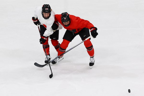 Renata Fast and Emma Maltais play during training for the Canadian women’s Olympic hockey team on Wednesday. The team’s game against Finland was postponed after several Finnish players contracted norovirus.Susana Vera/Reuters