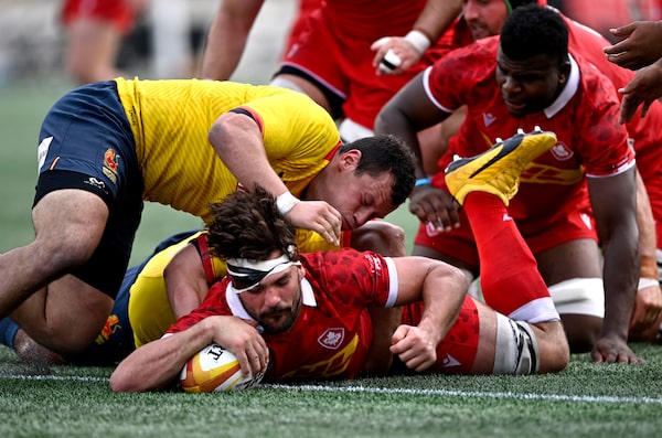 Canada's Lucas Rumball (7) scores a try during the second half of men's 15s international rugby action against Spain in Ottawa, on Sunday, July 10, 2022. Rumball will suit up for Canada on its three-test trip to Europe in November.Justin Tang/The Canadian Press