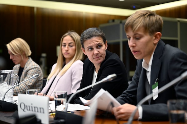 Canadian National Soccer Team player Christine Sinclair, centre, prepares to appear before the Standing Committee on Canadian Heritage in Ottawa, along with teammates Sophie Schmidt, Janine Beckie, and Quinn, on March 9.Justin Tang/The Canadian Press