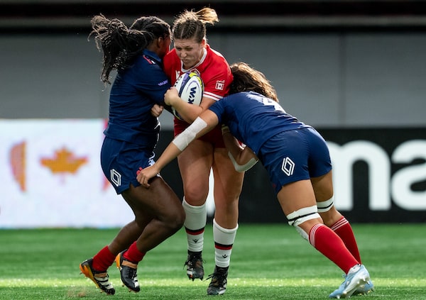 France's Madoussou Fall, left, and France's Manae Feleu, right, tackle Canada's DaLeaka Menin during WXV 1 women's rugby union action, in Vancouver, Sunday, Sept. 29, 2024.ETHAN CAIRNS/The Canadian Press