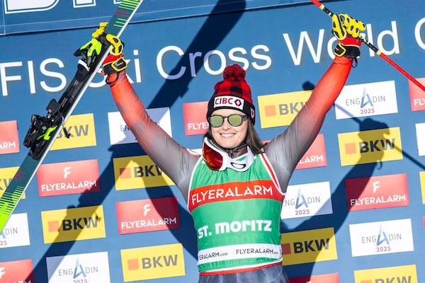 Marielle Thompson celebrates on the podium after winning a gold medal at World Cup women’s ski cross in Georgia.The Canadian Press