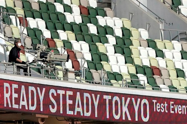 A TV cameraman sits beside empty spectators' seats during an athletics test event for Tokyo 2020 Olympics Games at the National Stadium, in Tokyo on May 9, 2021. Tens of thousands of visiting athletes, officials and media are descending on Japan for a Summer Olympics unlike any other. There will be no foreign fans, no local fans in Tokyo-area venues. A surge of virus cases has led to yet another state of emergency.The Canadian Press