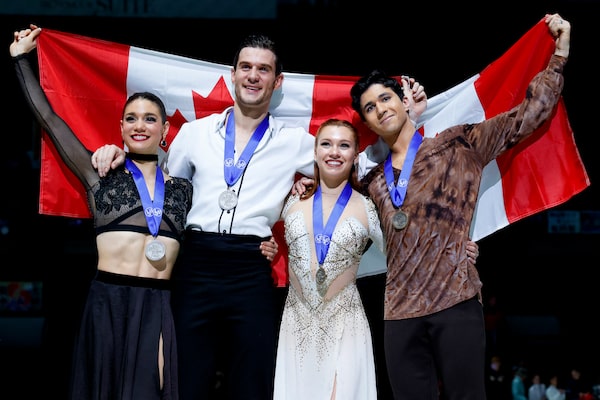 Laurence Fournier Beaudry and Nikolaj Soerensen of Canada and Marjorie Lajoie and Zachary Lagha of Canada pose with their medals after the Ice Dance Free Dance program during the ISU Four Continents Figure Skating Championships at Broadmoor World Arena in Colorado Springs, Colo. on Feb. 12.Michael Ciaglo/USA TODAY Sports via Reuters