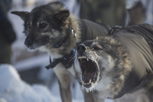 Sled dogs bark at the start line of the Yukon Quest at Shipyards Park in Whitehorse on Feb. 2, 2019.Crystal Schick/The Canadian Press