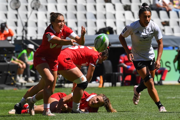Canada's Chloe Daniels passes the ball during a women's HSBC World Rugby Sevens Series 2023 match against New Zealand, in Cape Town, on Dec. 10, 2023.RODGER BOSCH/Getty Images