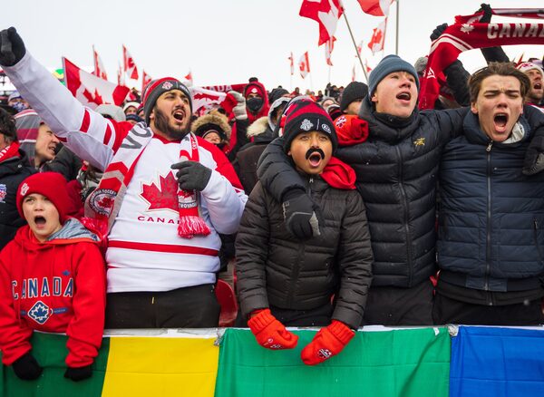 As the Canadian team’s bus pulled up to the stadium, hundreds of Voyageurs and others chanted lustily, unleashing a flurry of smoke bombs that turned the air thick and apocalyptic with red and yellow and grey clouds. Later, when the bus of the opposing Jamaican team rolled up, boos rang out. Someone in the crowd lobbed a single snowball that smacked against a bus window.