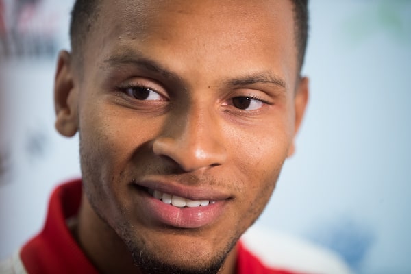 Canadian sprinter Andre De Grasse smiles while responding to questions after a news conference for the Harry Jerome International Track Classic in Vancouver on June 25, 2018.DARRYL DYCK/The Canadian Press