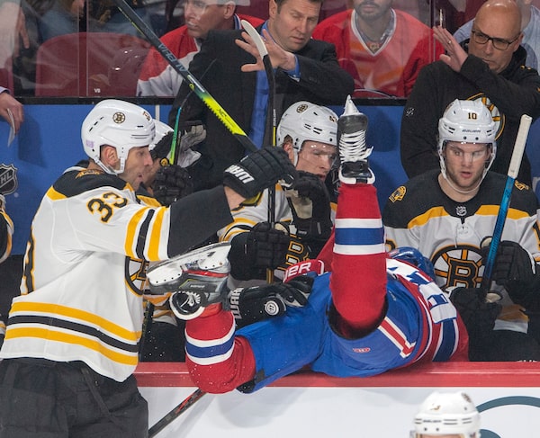 Boston Bruins defenceman Zdeno Chara (33) checks Montreal Canadiens right wing Joel Armia (40) into the Bruins bench during first period NHL hockey action Tuesday, November 26, 2019 in Montreal.Ryan Remiorz/The Canadian Press