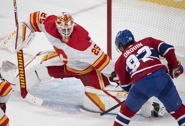 Montreal Canadiens' Jonathan Drouin (92) moves in on Calgary Flames goaltender Jacob Markstrom during second period NHL hockey action in Montreal, Saturday, January 30, 2021.The Canadian Press
