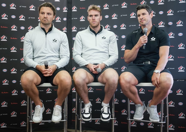 From left, Sam Reinhart, Connor McDavid and Sidney Crosby, head up Team Canada's first team consisting of NHL players since the 2014 Olympic Games.Jeff McIntosh/The Canadian Press