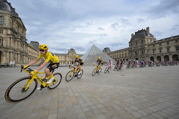 Jonas Vingegaard leads the pack past the Louvre Pyramid during the final stage of the 110th edition of the Tour de France on July 23, 2023.ALAIN JOCARD/AFP/Getty Images