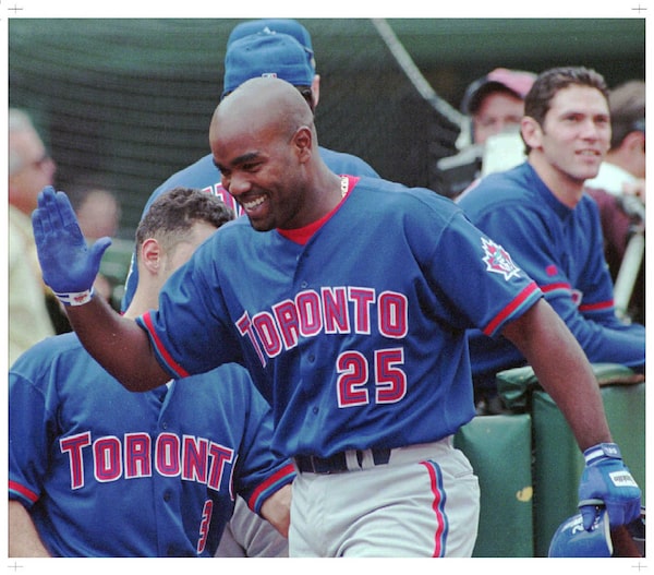 Toronto Blue Jay Carlos Delgado happily greets his teammates after he hit a two-run homer in the fourth inning against the Oakland Athletics on Sunday, May 3, 1998 in Oakland, Calif.Susan Ragan/The Associated Press